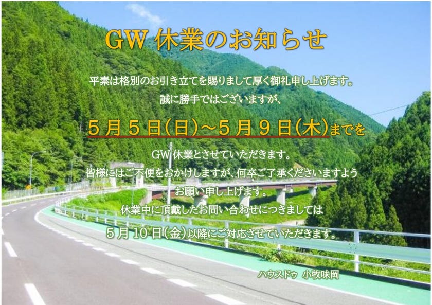 ゴールデンウィーク休業のお知らせ いつもハウスドゥ小牧味岡のホームページをご覧いただきありがとうございます。 誠に勝手ではございますが、下記の期間を...