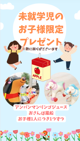 リンゴジュースとおさんぽ風船(それぞれ1つずつ)プレゼント!