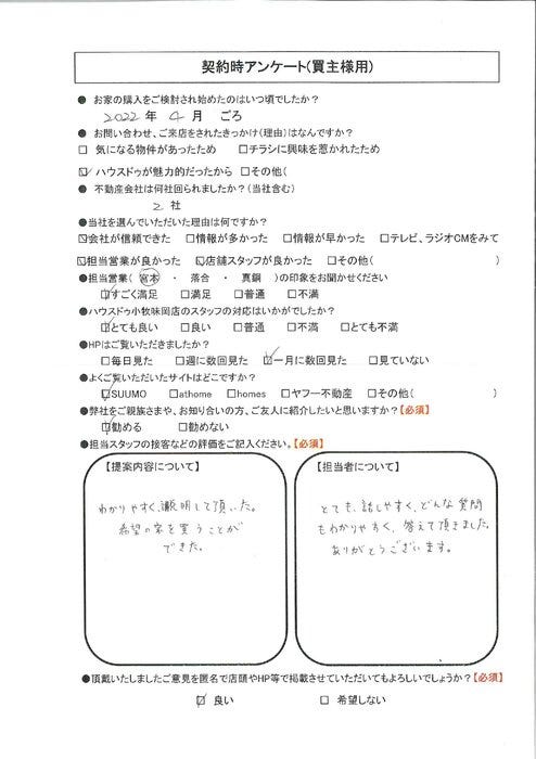 【提案内容について】わかりやすく説明をしていただいた。希望の家を買うことができた。 【担当者について】とても話しやすく、どんなん質問もわかりやすく答えていただきました。