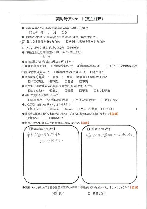 【提案内容について】希望・予算に合う提案をしていただいた。 【担当者について】わかりやすく説明していただいた。
